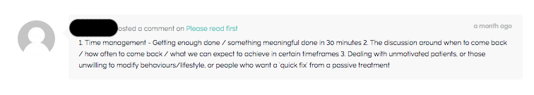 Here is a common example of a start point for a participant on our Strive & Thrive in Private Practice, when listing the areas of their concern as a new and recent graduate: