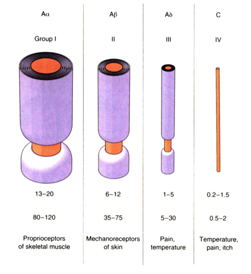The other classification system is that of Lloyds and based upon fibre diameter. Group I, II and III are all myelinated with the Group I being thickest and diminishing in diameter with increasing number, while IV is unmyelinated. The different classification systems, fibre diameters, conduction velocity and information transmitted are summarised in the adjoining picture.