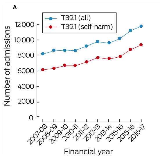 So if paracetamol is as good as placebo, and placebo has some benefit, what is the problem? This was my other eye opener (both eyes open now!). Remember we look at an interventions from benefit and risk perspectives, well paracetamol is the drug most frequently taken in overdose in Australia. Check out the graph from this 2019 paper. The blue line represents all presentations to ED due to paracetamol overdose and the red line represents the proportion of cases attributed to self‐harm (consistently exceeded 75% of the total each year). So a lot of people are overdosing on paracetamol (mean number of deaths per year were 43). That is a short term effect, the other aspect is regular overuse of paracetamol can result in liver toxicity. So none to negligible benefit using paracetamol, but a significant acute and chronic use risk.