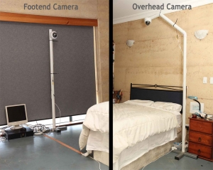 So the final setup for my Masters project was this. One camera was placed at the foot end of the bed, 1.8m high and the other one on an overhead support, directly over the middle of the average bed. It was built to be 2.3m high, enabling it to fit under a standard 2.4m ceiling. These were linked to a monitor, enabling checking of the camera alignment and a digital video recorder.